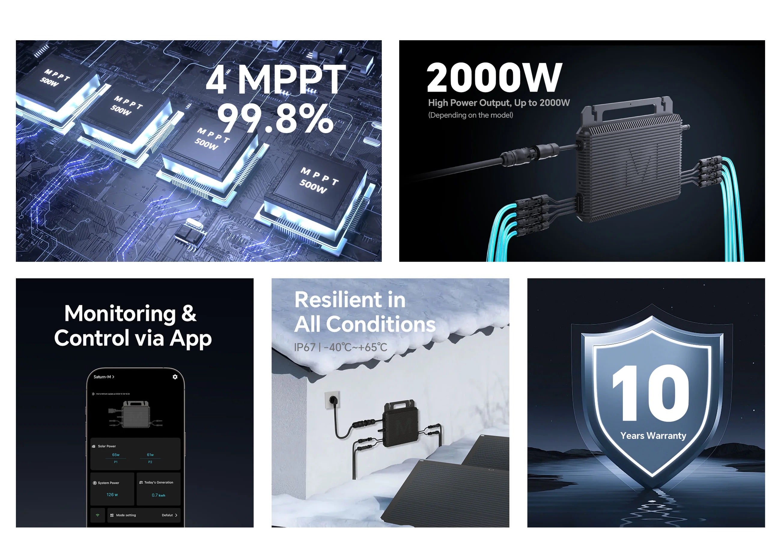 Der Marstek Saturn MST‑MI0800 ist ein leistungsstarker, einphasiger netzgekoppelter Mikrowechselrichter mit einer Ausgangsleistung von 800 VA, ideal für Balkonkraftwerke und kleine PV‑Anlagen.