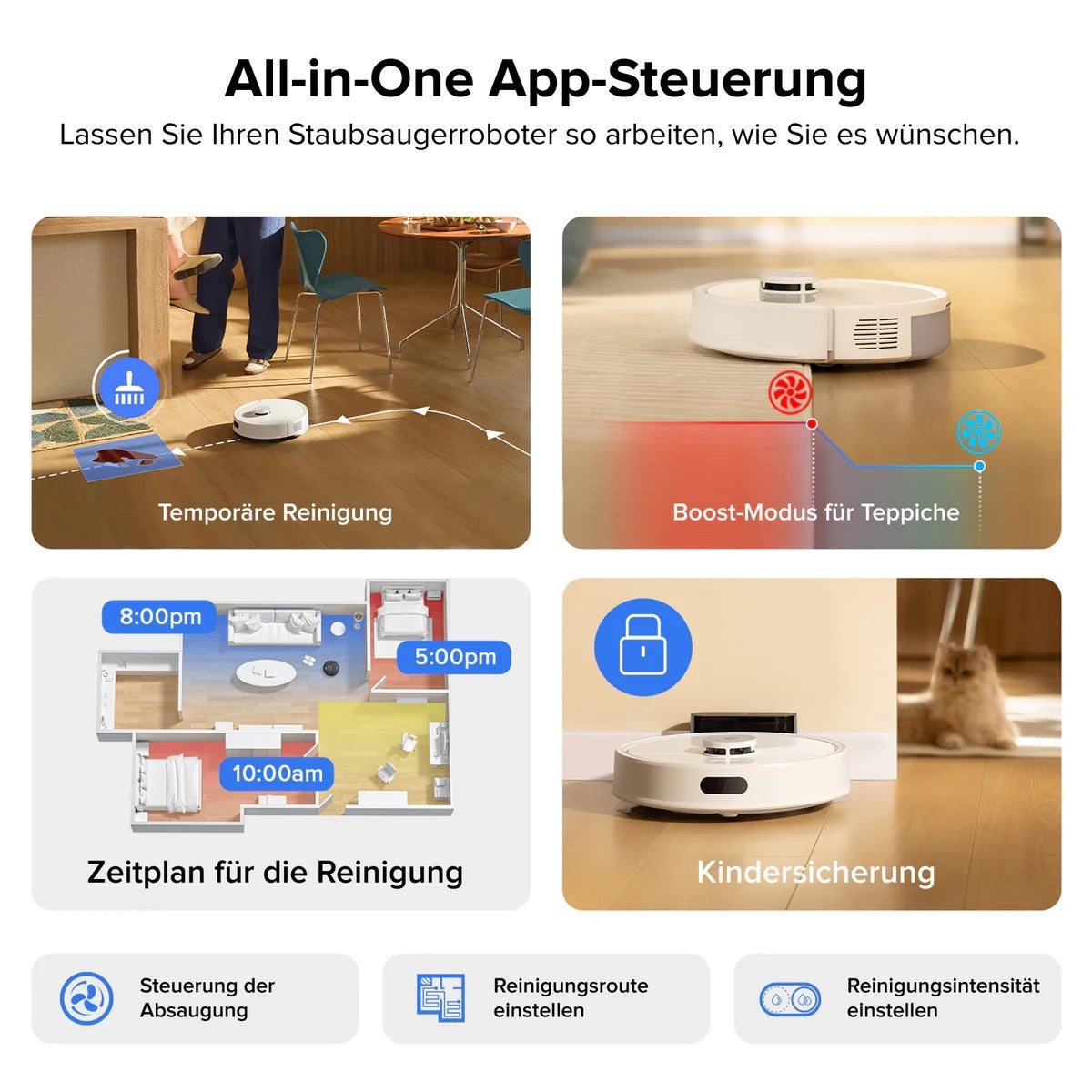 • App-Steuerung: individuelle Reinigungspläne, Sperrzonen und Echtzeit-Verfolgung per Smartphone.