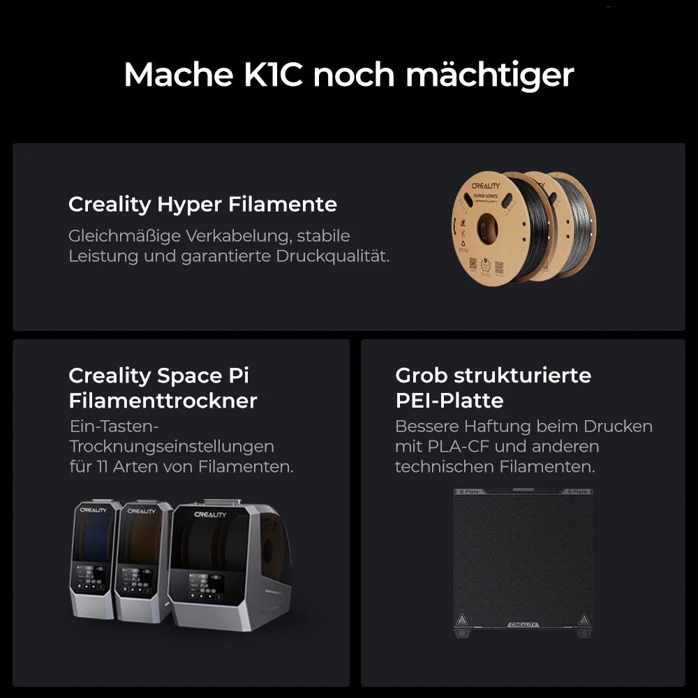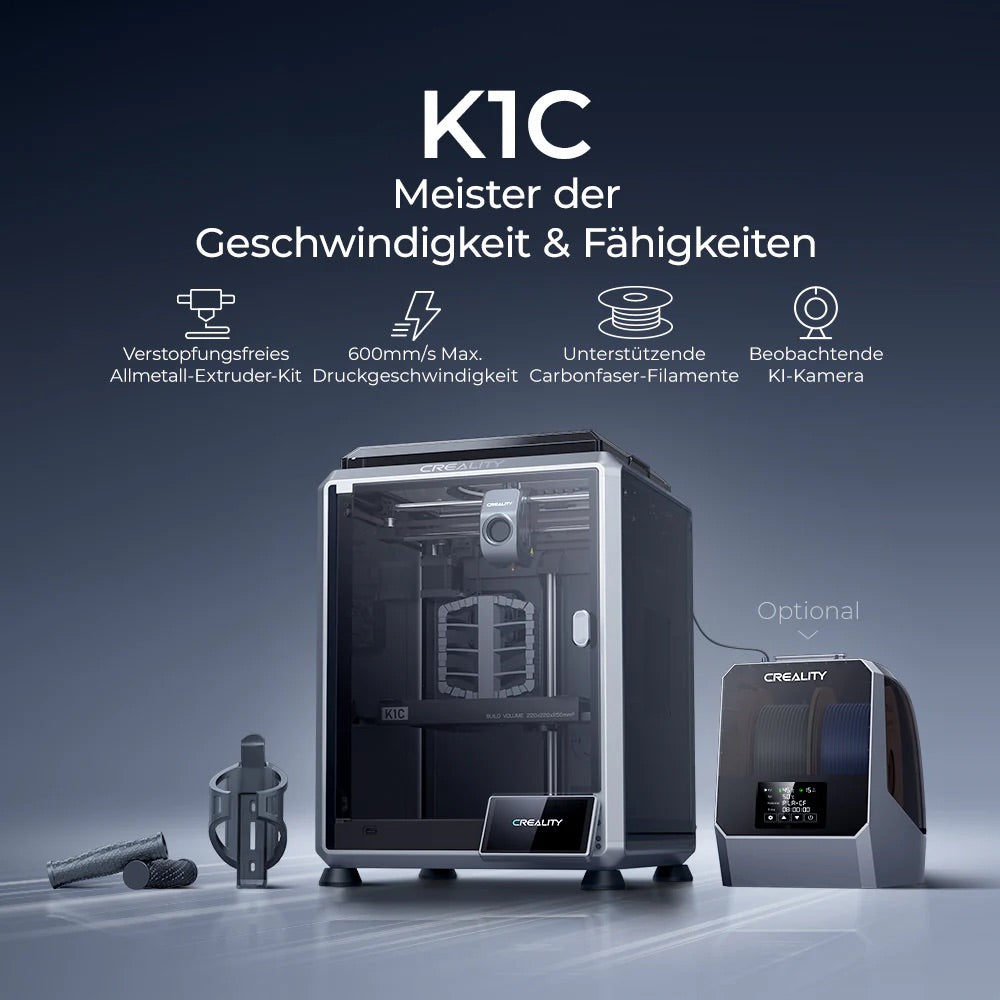 Der Creality K1C ist ein leistungsstarker CoreXY-3D-Drucker der neuesten Generation. Mit hoher Geschwindigkeit, stabiler Bauweise und einfacher Bedienung richtet er sich an Maker, Profis und Einsteiger gleichermaßen. Durch seine präzise Extrusion, smarte Features und offene Materialkompatibilität liefert er hochwertige Drucke bei minimalem Aufwand.